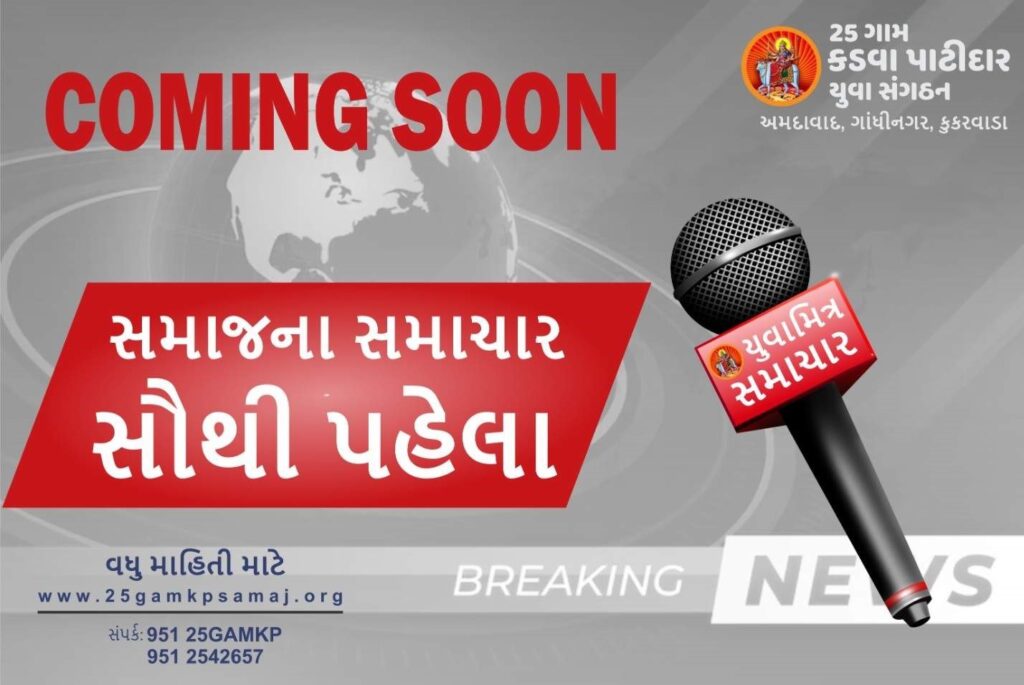 યુવામિત્ર સમાચાર “આપણા વિસ્તારનો અવાજ – આપણી સાથે, આપણી માટે” આપણી કોમ્યુનિટી માટેનું નવું લોકલ ન્યૂઝ પ્લેટફોર્મજ્યાં હશે સાચી ખબર,… ઉમા માર્ટ હોલ ના મુખ્ય દાતાશ્રીઓ ઉમા માર્ટ હોલના નિર્માણ અને વિકાસમાં અમૂલ્ય યોગદાન આપનાર તમામ દાતાશ્રીઓનો 25 ગામ કડવા પાટીદાર સમાજ હૃદયપૂર્વક આભાર… Cricket Tournament – 25 ગામ કડવા પાટીદાર – KPPL આપના સમાજમાં ખેલમેળાનું ઉત્સવ આવી ગયું છે! 25 ગામ કડવા પાટીદાર યુવા સંગઠન દ્વારા આયોજિત ક્રિકેટ ટૂર્નામેન્ટ તારીખ… 12% ડિવિડન્ડ જાહેર કરવામાં આવ્યું 25 ગામ ઉમિયા કો-ઓપરેટીવ ક્રેડિટ સોસાયટી લિમિટેડ વિહાર સભાસદોને જણાવતા ખૂબ જ આનંદ થાય છે કે ચાલુ વર્ષ…